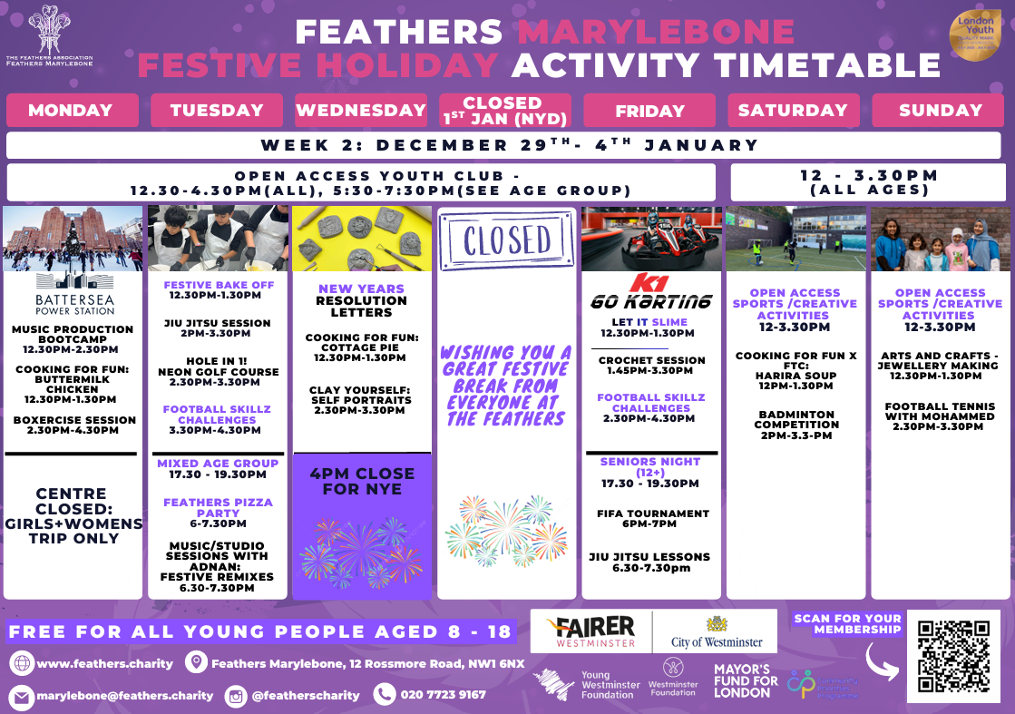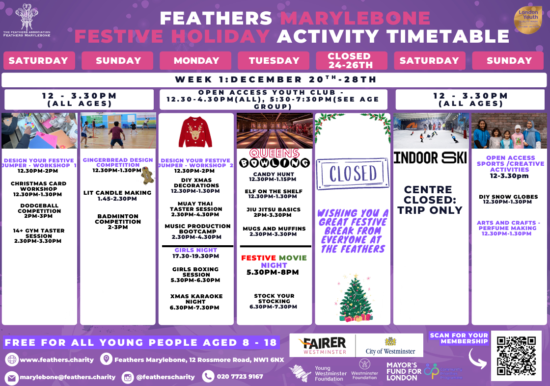 Feathers Marylebone is CLOSED on: 24th December, 25th December, 26th December & 2nd January Please check the attached Festive Holiday Activity Timetable for the complete dates and times of activities, and when we are open this Holiday Season 2025/26!